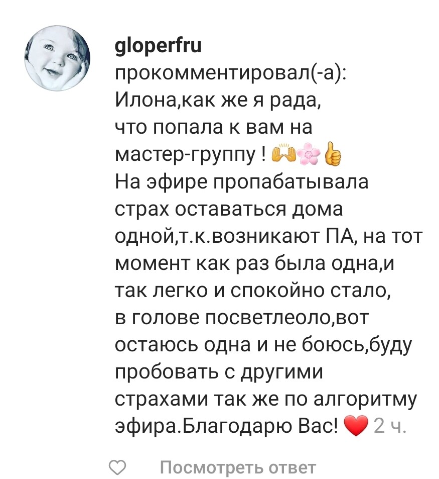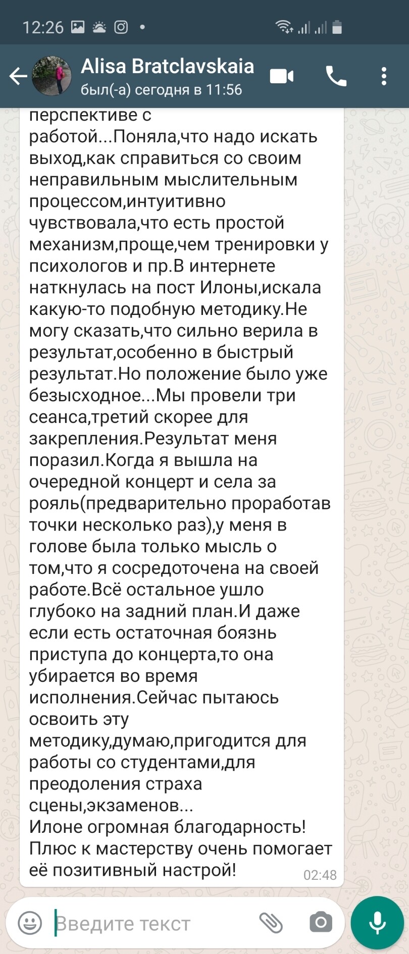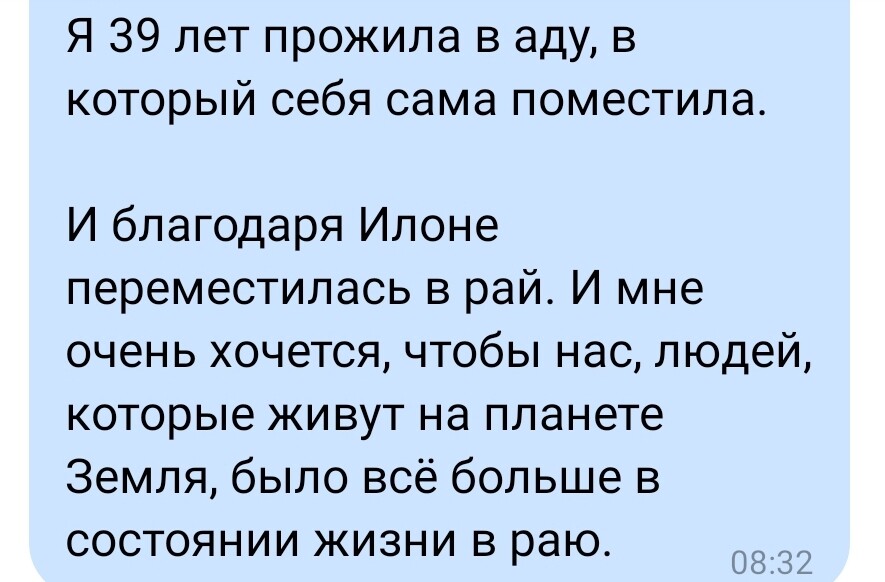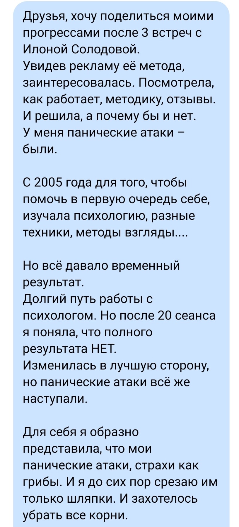 Друзья, я прошла обучение у Илоны Солодовой. Очень активно практикую Терапию Мыслеполя для себя, семьи и с клиентами. Эффективность практики подтверждаю! Рекомендую.