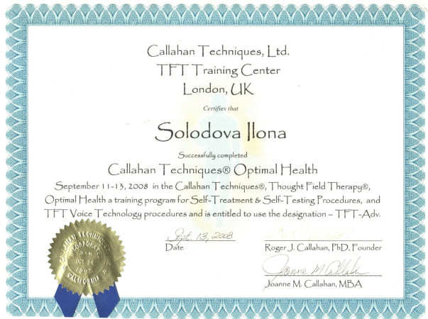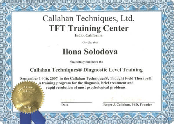 Единственный в мире русскоязычный Сертифицированный тренер по технологии Мыслеполя, ученица Р. Каллахана - основателя метода.