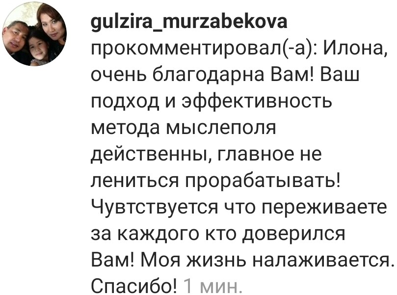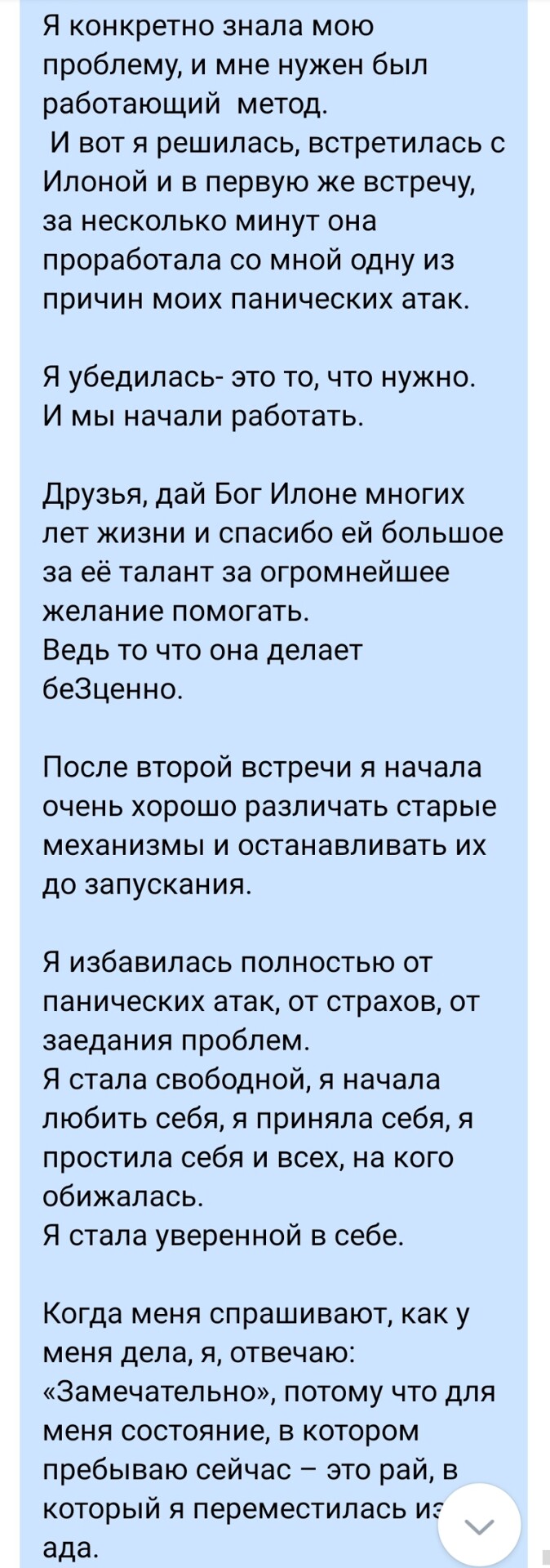 Друзья, я прошла обучение у Илоны Солодовой. Очень активно практикую Терапию Мыслеполя для себя, семьи и с клиентами. Эффективность практики подтверждаю! Рекомендую.